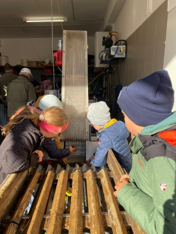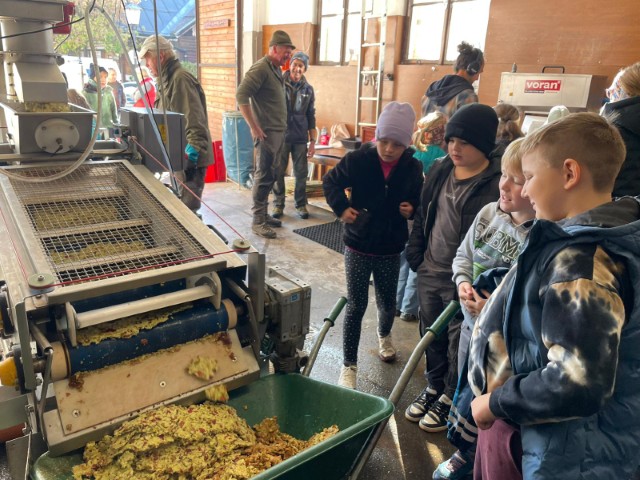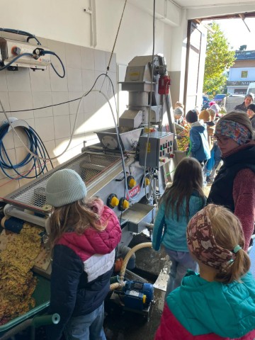Mit viel Begeisterung verfolgten die Kinder den gesamten Pressvorgang – von der gewaschenen Frucht bis zum fertigen Saft. Das Ergebnis: 110 Liter köstlicher Apfelsaft!